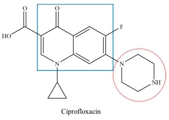 Structural formula of ciprofloxacin, where the blue box is the quinolone structure of ciprofloxacin and the red circle is the piperazine ring.