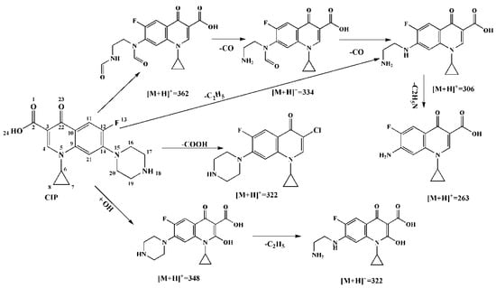 Based on previous studies focusing on advanced oxidation, ciprofloxacin is most likely to degrade at the quinolone moiety and piperazine ring, as shown in Figure 6 []. The product at [M+H]+ = 362 should be attributed to the oxidation of piperazine. N15 and N18 of the piperazine ring are attacked by the hydroxyl radicals to form two ketogroups []. [M+H]+ = 344 is formed by the CO loss of [M+H]+ = 362 []. The product at [M+H]+ = 306 is devinylciprofloxacin, caused by the net loss of C2H5 of the ciprofloxacin piperazinyl substituent or [M+H]+ = 334. Intermediate products are formed by the secondary loss of –CO [], and literature studies have suggested that devinylciprofloxacin was formed directly from ciprofloxacin through an unknown mechanism involving an attack by the hydroxyl radicals []. The product at [M+H]+ = 263 was aniline formed by the loss of –C2H5N from devinylciprofloxacin []. The product at [M+H]+ = 362 is also considered to result from the hydroxylation and carbonylation of an uncleaved piperazinyl ring [] due to the initial attack on the carbon–carbon double bonds by the hydroxyl radicals []. According to the study of Cheng et al., the first addition of the hydroxyl radicals may take place on the atom with the highest FED2 HOMOb2FED2 LUMO value, observed on the quinolone ring. Thus, the most reasonable addition of the hydroxyl radicals can occur at the positions C4 and C11. The intermediate product [M+H]+ = 348 is generated by the hydroxyl radical attacking the C4 atom []. Wang et al. also concluded that the hydroxyl group is most likely to attack the quinolone ring, and [M+H]+ = 348 is considered to be the product of the hydroxylation process []. [M+H]+ = 322 is the product of [M+H]+ = 348 losing –C2H2, however, there is also a possibility that the quinolone ring in the ciprofloxacin structure loses –COOH and is replaced by Cl []. Figure 7 shows a possible pathway for the catalytic degradation of ciprofloxacin by the Fe2O3/RGO-ATP/H2O2 system.