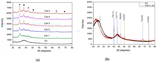 (a) XRD patterns of activated carbon (AC) and Pd/Cu@AC catalysts prepared using different solvents: (Cat 1) EtOH, (Cat 2) ethylene glycol (EG), (Cat 3) PEG 300, (Cat 4) PEG-OMe 350, and (Cat 5) PEG-OMe 500. (*) Diffraction of Pd in Pd/Cu@AC and (◆) diffraction of Cu in Pd/Cu@AC; (b) XRD patterns of AC and Cat 5 PEG-OMe 500.