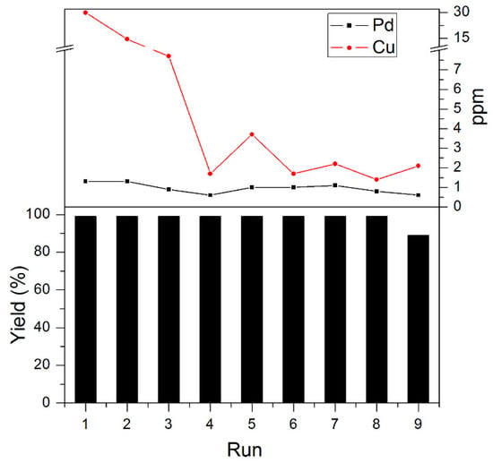 The control experiments using 0.5 ppm Pd and 1 ppm Cu afforded less than 41% yields. However, the Pd and Cu concentrations did not clearly change in the 9th recycle with yield decline, ruling out the possibility that the leached Pd and Cu were the catalytic species. These results showed that the supported bimetallic Pd/Cu NPs were responsible for the catalytic activity.