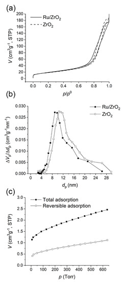 Hydrogen chemisorption at 75 °C was performed for the Ru/ZrO2 catalyst as suggested by Shen et al. [40] using Thermo Scientific Surfer equipment. Prior to the analysis, the catalyst sample (300 mg) was reduced in hydrogen flow at 290 °C for 3 h (heating rate 5 °C min−1) and degassed in the same temperature for 2 h. The total adsorption isotherm was measured first, after which the sample was evacuated down to 10−5 Torr, and the reversible adsorption isotherm was measured. The irreversible monolayer volume was obtained from the linear regression of the subtracted isotherm to zero pressure. The dispersion and metal particle size were calculated from the irreversible monolayer volume assuming spherical particles and gas–metal stoichiometry of 2:1 as described by [41].