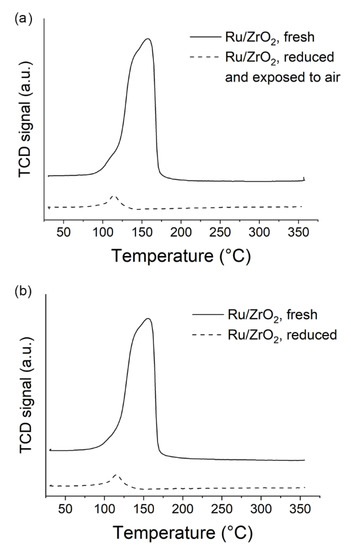 Temperature-programmed reduction (TPR) profiles of Ru/ZrO2 catalyst before and after reduction at 350 °C for 2 h. (a) The catalyst was exposed to air for 20 min after reduction, (b) the catalyst was not exposed to air.