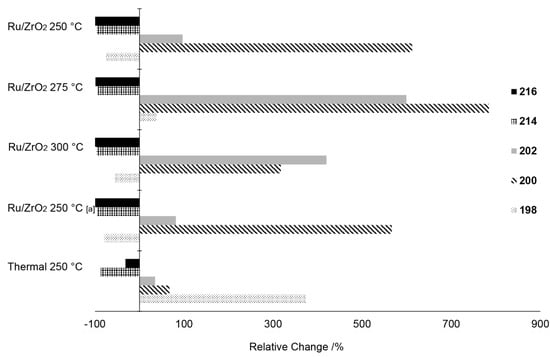 The analysis of the dimer mixture (referred to also as feed) with high-performance liquid chromatography (HPLC) revealed six main components with molecular weights of 216 (70 area-%), 214 (10 area-% including both isomers), 202 (4 area-%), 200 (10 area-%), and 198 (6 area-%). In addition to these dimers, various isomers could also have formed during the production of the feed mixture. HPLC total ion current (TIC) chromatograms of the feed and selected products are presented in the Supplementary Materials (Figure S5). In addition, the mixture also contained a small amount of unreacted LA. The relative changes (Equation (2)) of individual dimers are presented in Figure 5. A positive relative change indicates a net increase in the amount during the reaction. Especially the more reactive dimers (214a, 214b and 216) were converted with relative changes of over −90% not only to other products, but also to less reactive dimers, such as dimers 200 and 202 in all the catalytic experiments. The reactions of dimers 214a, 214b, and 216 in hydrogenating conditions through HDO and further lactone formation were also observed by Käldström et al. [7]. In addition to dimers 214a, 214b, and 216, dimer 198 was mainly consumed in the catalytic experiments, whereas dimers 200 and 202 were formed. No significant difference was obtained with the higher batch residence time (1.1 gcat gfeed−1 h). The thermal experiment was not able to fully convert dimers 214a, 214b, and 216, unlike the catalytic experiments, but interestingly, a significant production of dimer 198 was observed.