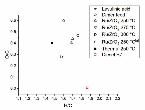 van Krevelen diagram of the molar H/C and O/C ratios of the dimer feed and the organic liquid product mixtures compared to levulinic acid and standard diesel [29]. [a] τb = 1.1 gcat h gfeed−1.