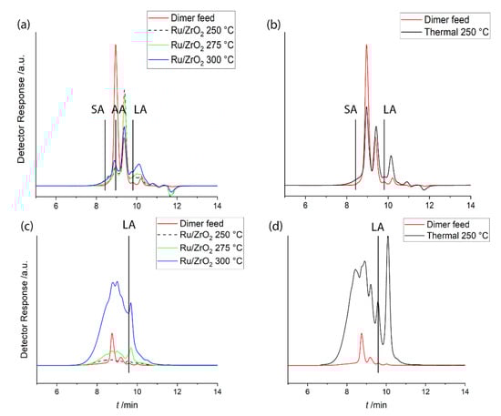 Gel permeation chromatography (GPC) chromatograms of the dimer feed and the products obtained with Ru/ZrO2 catalyst and thermally at various temperatures. (a,b) with refractive index (RI) detector (equal scaling), and (c,d) with UV detector (270 nm, equal scaling). SA: stearic acid (284 amu), AA: azelaic acid (188 amu), LA: levulinic acid (116 amu).