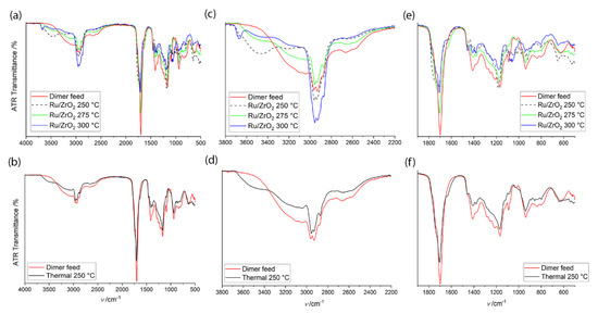 Infrared (IR) spectra of the dimer feed and the samples obtained with the Ru catalyst and thermally are presented in Figure 8. All the samples were highly complex and contained several functional groups; thus, IR could only be used to indicate the disappearance or appearance of certain functional groups. In the O–H stretching region (Figure 8c,d), the broad band from 3400 cm−1 to 2400 cm−1, especially visible with the feed, is attributed to O–H in carboxylic acid [31]. The peak has overlapping with sp3 C–H stretching, which is visible as a sharper band at ca. 3000–2850 cm−1 with three peaks [31]. The O–H stretch band from carboxylic acid decreased slightly in the thermal experiment, but more so with the catalysts, suggesting the consumption of acid groups. Figure 8c,d also contain information of O–H stretching from alcohols or water trapped in the organic product, which is visible both with the catalyzed and the thermal experiments. The band from 3600 to 3300 cm−1 is attributed to O–H with H-bonding and the peak at 3650 cm−1 (Ru, 300 °C) is attributed to free O–H [31,32]. At high temperature, less oxygen was left in the product (Figure 6); thus, there was less hydrogen bonding between the molecules causing the emerging of the free O–H stretching with Ru at 300 °C.