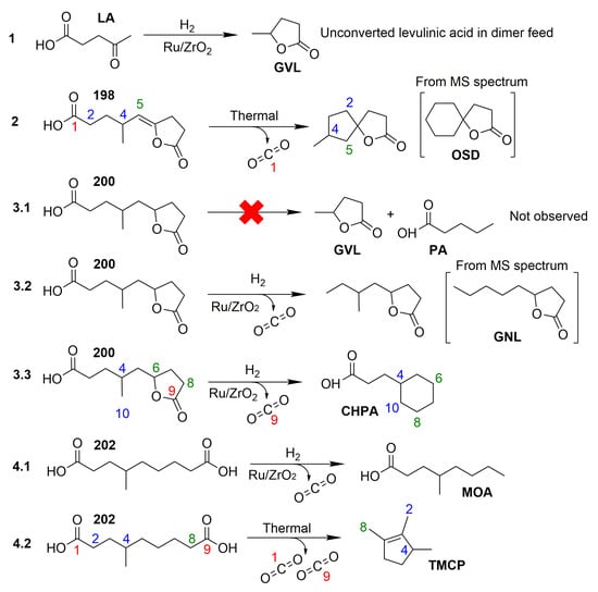 A comparison of the thermal experiment to the catalyzed experiments can clarify which reactions occurred thermally and for which reactions the catalyst was responsible. Firstly, the decarboxylation of LA dimers occurred thermally, although it was enhanced by the catalyst (Section 2.5). Thus, the ketones that were produced thermally (Table S2) could have been formed by the decarboxylation of e.g., dimers 214a and 216 on both ends, leaving behind a C8 ketone. Furthermore, the high formation of dimer 198 from dimer 216 in the thermal experiment indicates that an intramolecular cyclization could occur thermally, which would explain the thermal formation of 1,2,3-trimethylcyclopentene (TMCP) and 1-oxaspiro(4,5)decan-2-one (OSD) (Scheme 2). TMCP and OSD were formed to a much lesser extent in the catalytic experiment at 250 °C than in the thermal experiment at 250 °C (Figure S6 no. 1 and 14). Thus, TMCP and OSD might have been formed only thermally, simultaneously to the catalyzed reactions. All the other reactions illustrated in Scheme 2 occurred only on the catalyst. The catalyst was responsible for the formation of acids (especially cyclohexanepropanoic acid (CHPA)) and esters (especially lactones).