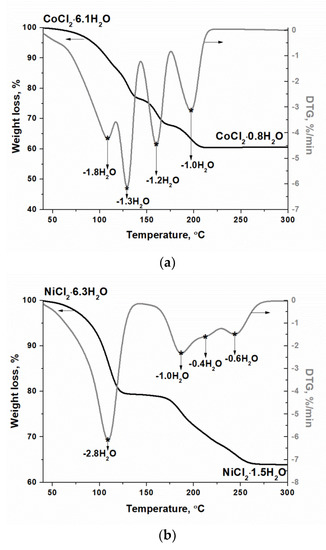 According to the results of the thermal analysis, these salts easily lose water beginning from 40 °C (Figure 1a,b). In the temperature region from 40 to 300 °C, four stages of dehydration are distinguishable in the derivative thermogravimetry (DTG) curves. For the cobalt chloride hydrate the greatest losses of mass were observed at 110, 130, 160 and 195 °C. In the case of the nickel chloride hydrate, most of the water was removed at 110 °C, and with further increase in temperature the change in the mass became less pronounced, the lower values being observed in the DTG curves at 185, 215 and 245 °C. It should be noted that at 150 °C almost half of the water was removed from both hydrates. A constant mass of the cobalt and nickel salts was reached at 220 and 280 °C, respectively.