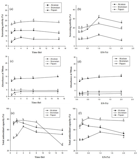 Antioxidant effect of the three EPHs (alcalase, bromelain, and papain) using three antioxidant assays: (a) Antioxidant effect at different times based on DPPH free radical scavenging assay; (b) Antioxidant effect at different enzyme concentrations based on DPPH free radical scavenging assay; (c) Antioxidant effect at different times based on reducing power assay; (d) Antioxidant effect at different enzyme concentrations based on reducing power assay; (e) Antioxidant effect at different time based on ABTS total antioxidant capacity; (f) Antioxidant effect at different enzyme concentrations based on ABTS total antioxidant capacity. Means in the same form with various characters denote significant differences (p < 0.05). Data are expressed as mean±SD from triplicate determinations.