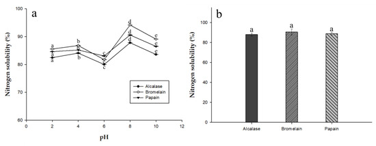 Nitrogen solubility (%) of the three EPHs in (a) water at different pH levels (2, 4, 6, 8, and 10) and (b) herbal eel extracts. Means in the same form with various characters have significant differences (p < 0.05). Data are expressed as mean ± SD from triplicate determinations.