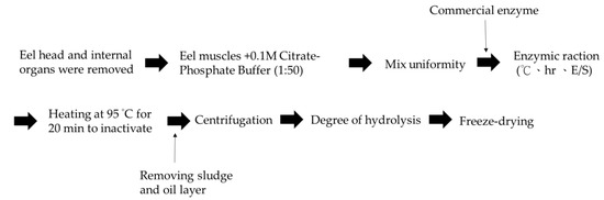 1 g eel meat was added to 0.1 M phosphate-citrate buffer solution (pH 7.5) at a 1:50 ratio then homogenized, before the addition of different concentrations of the three enzymes, as shown in Table 5. The enzyme was inactivated by heating the solution to 95 °C for 20 min before it was freeze-dried to obtain EPH. The sample was then stored at −20 °C until further analysis. The scheme of the hydrolysis process of Anguilla marmorata is shown in Figure 4.