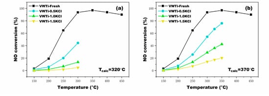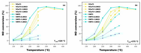 Comparison of activities between V2O5-WO3/TiO2 and V2O5-Ce(SO4)2/TiO2 catalyst samples with KCl deposition at different Tcalc: (a) 320 °C; and (b) 370 °C.