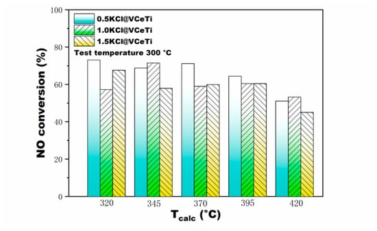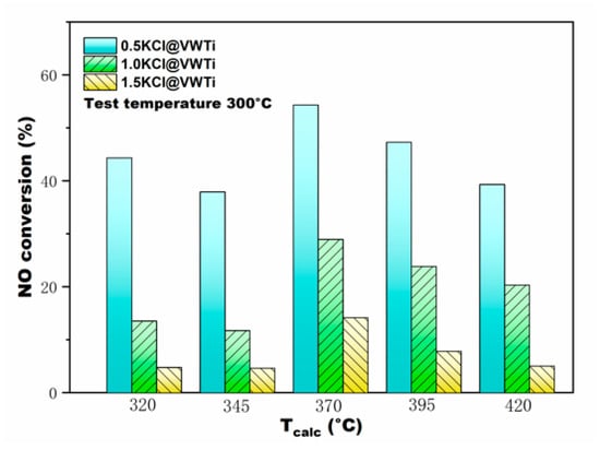 Figure 1 illustrates the performance of the VWTi catalyst with different KCl deposition contents under different calcination temperatures. The catalytic activity of VWTi catalysts decreased with increasing of the molar ratio of n(K)/n(V) (i.e., the molar ratio of KCl and V2O5), although the calcination temperature (Tcalc) was different (Tcalc = 320 and 370 °C; Tcalc was 20 °C higher than the highest test temperature). Obviously, the catalytic activity decreased significantly owing to the KCl deposition. It indicates that VWTi is susceptible to the alkali species as KCl; especially when the molar ratio of n(K)/n(V) is 1.5, the NO conversion decreased by more than 50%. The results are consistent with the poisoning phenomenon that occur during the operation of a biomass power plant: the catalytic activity decreases due to the deposition and accumulation of KCl. The alkali metal ions (K+) evaporated from the fuel will absorb on the catalysts surface and form solid KCl particles on the catalyst surface [9]. Moreover, a parallel tendency of the VWTi catalysts calcinated at 345, 395, and 420 °C was obtained and N2-selectivity (>95%) of VWTi catalysts was barely affected by KCl. Figure 2 depicts the NO conversion of poisoned VWTi with different Tcalc. Fluctuations were clearly observed with different Tcalc, while all the VWTi catalysts activities dropped due to KCl deposition. The highest point of NO conversion can be explained by the fact that NO conversion of fresh VWTi peaked at 370 °C. The reason for the decrease of NO conversion at 345 °C is that diffusion of small KCl clusters on the catalyst surface led to increasing interface per unit mass of KCl, which is equivalent to the covering of likely active catalytic sites [24,25,26]. The decreased degree of NO conversion at 345 °C was weakened obviously at elevated n(K)/n(V). Therefore, the two effects, of alkali metal and the NO conversion fluctuations of fresh catalysts, together led to the results demonstrated in Figure 2.