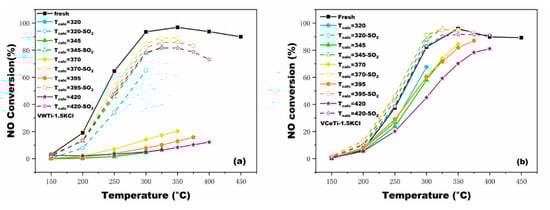 The SO2 treatment on poisoned VCeTi catalysts was also employed, and experimental results are plotted in Figure 5b. The activity of poisoned VCeTi was promoted after SO2 treatment, and barely fluctuated after Tcalc = 320 °C. It is more interesting that the activity of the regenerated catalyst was even better than that of the fresh catalyst. The reasons for this are more Brønsted acid sites were formed from potassium sulfate and active sites emerged due to surface sulfation by SO2 [29]. As reported, the number of Brønsted acid sites increased because the surface sulfates on TiO2 were converted to bidentate surface species (acidic S−OH groups) [30,31,32,33], and the reaction rate increased as a result of more Brønsted acid sites [34].