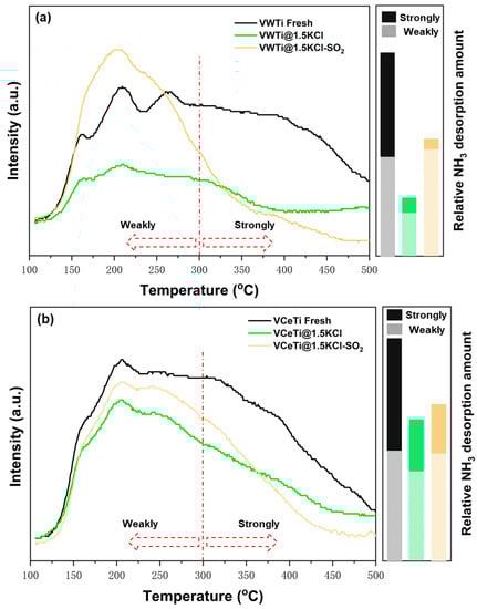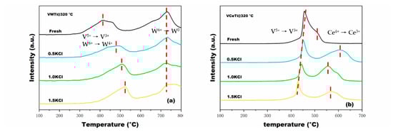 The H2 consumption of fresh and poisoned catalysts was obtained through H2-TPR experiments. As shown in Figure 7a, VWTi catalyst exhibited two TPR peaks: TPR Peak (1) at low temperatures shifted towards high temperatures with the deposition of KCl, whereas TPR Peak (2) at high temperatures did not change. Peak (1) was assigned to the reduction of V5+ to V3+ and W6+ to W4+ [41], which revealed that the redox ability of V and W was decreased after deposition of KCl, consistent with the activity results. Peak (2) belongs to the reduction of W4+ to W0 [42]. The H2 consumption peak of fresh VCeTi catalyst contained two overlapped reduction peaks, which can be assigned to V5+ and Ce4+, respectively, and a synergistic effect between Ce4+ and V5+ appeared due to the adjacent peak positions. Through the deposition of KCl, a deviation of the TPR reduction peak was observed, the former peak being related to the reduction of V5+ to V3+, while the latter being assigned to the reduction of Ce4+ to Ce3+ [17,43,44]. It is reported that oxygen vacancies are yielded with the conversion of Ce4+ to Ce3+ [45]. Oxygen vacancies are beneficial to catalytic activity, thus making VCeTi catalysts perform better than VWTi.