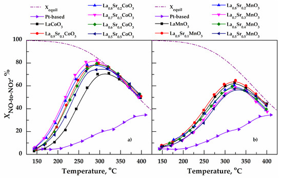 - Onrubia, J.A.; Pereda-Ayo, B.; De-La-Torre, U.; González-Velasco, J.R. Key factors in Sr-doped LaBO3 (B = Co or Mn) perovskites for NO oxidation in efficient diesel exhaust purification. Appl. Catal. B Environ. 2017, 213, 198–210. [Google Scholar] [CrossRef]