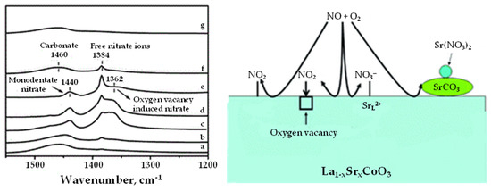 - Milt, V.G.; Ulla, M.A.; Miró, E.E. NOx trapping and soot combustion on BaCoO3−y perovskite: LRS and FTIR characterization. Appl. Catal. B Environ. 2005, 57, 13–21. [Google Scholar] [CrossRef]