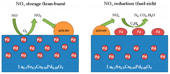 - Zhao, D.; Gao, Z.; Xian, H.; Xing, L.; Yang, Y.; Tian, Y.; Ding, T.; Jiang, Z.; Zhang, J.; Zheng, L.; et al. Addition of Pd on La0.7Sr0.3CoO3 Perovskite to Enhance Catalytic Removal of NOx. Ind. Eng. Chem. Res. 2018, 57, 521–531. [Google Scholar] [CrossRef]