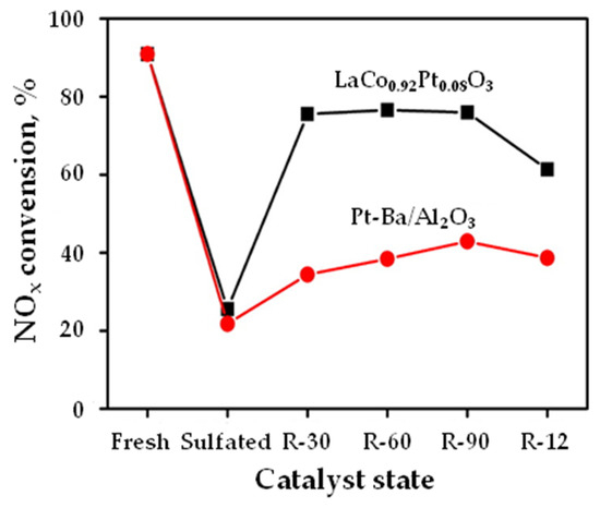 - Wang, X.; Qi, X.; Chen, Z.; Jiang, L.; Wang, R.; Wei, K. Studies on SO2 Tolerance and Regeneration over Perovskite-Type LaCo1-xPtxO3 in NOx Storage and Reduction. J. Phys. Chem. C 2014, 118, 13743–13751. [Google Scholar] [CrossRef]