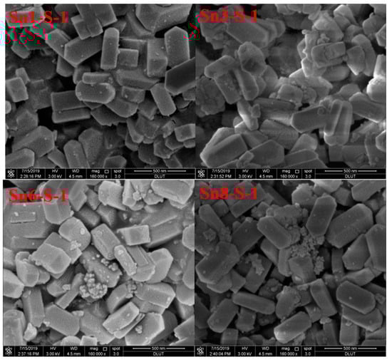 SEM images of Sn-containing defective S-1 (Snx-S-1) zeolite samples.