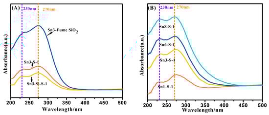 Figure 2 shows the UV–VIS spectra of Sn-containing catalysts with different matrixes (A) and the Sn-containing defective S-1 zeolite catalysts with different Sn loadings (B). So far, the UV–VIS spectroscopic technique has been widely used as an informative characterization method for Sn species in Sn-containing zeolites and molecular sieves [16]. Generally, from UV–VIS spectra, three kinds of Sn species have been identified in these Sn-containing materials. They are isolated tetracoordinated framework Sn species, nano-sized SnO2 clusters, and bulky SnO2 particles, corresponding to UV absorption at about 200–220 nm, 230–255 nm, and 280–290 nm, respectively [20,23,24,25,26]. In the present work, the absence of 200–220 nm absorption band for the Sn-containing samples with different matrixes (Figure 2A) and the Sn-containing defective S-1 zeolite samples with different Sn loadings (Figure 2B) indicates that there is substantially no isolated tetrahedral Sn species in these Sn-containing materials. That is, the DP process used in this study did not introduce Sn atoms into the zeolitic framework of S-1. However, all the samples had absorption bands at around 230 nm and 270 nm instead, and their intensities gained with the increase of Sn loading. Thus, from the absorption bands at around 230 nm and 270 nm, it is concluded that the Sn species in the catalysts of this study should mainly exist in the forms of hexa-coordinated nano-sized SnO2 clusters and bulky SnO2 species.