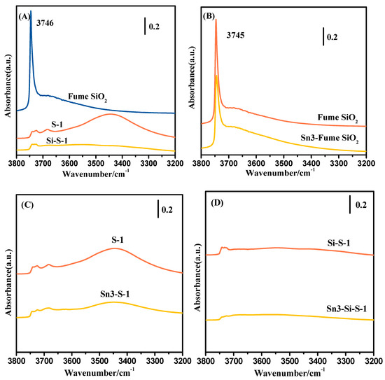 Hydroxyl stretching FT-IR spectra of different samples: S-1, Si-S-1, and fume SiO2 matrixes (A); fume SiO2 and Sn3-fume SiO2 (B); S-1 and Sn3-S-1 (C), Si-S-1 and Sn3-Si-S-1 (D).