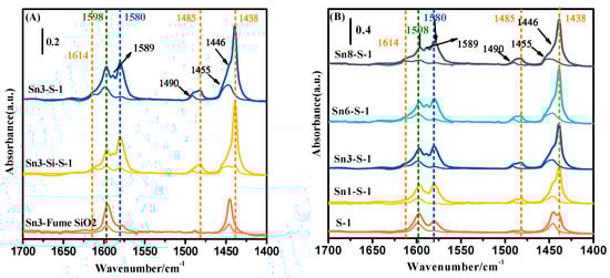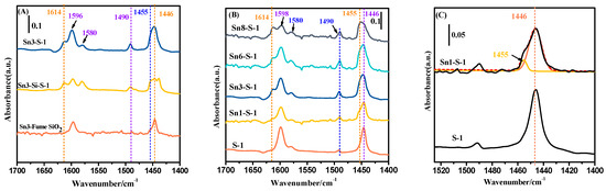 Pyridine adsorption FT-IR spectroscopy is currently a commonly adopted method for determining the type and number of acid sites of Sn-containing zeolites and molecular sieves. According to the literature reports [30,31,32,33,34,35,36,37], the Sn-containing zeolites and molecular sieves mainly have Lewis acid sites, and they usually give pyridine absorption bands in the range of 1450 to 1455 cm−1 and 1610 to 1615 cm−1. These bands are often accompanied by another important band at 1490 cm−1, which is generally considered as the contribution of pyridine adsorbed on both Brønsted acid sites and Lewis acid sites. However, in the Sn-containing zeolites and molecular sieves, Brønsted acid sites (1540–1545 cm−1) are seldom detectable unless a small number of trivalent metal ions such as Al3+ ions appear in the zeolitic framework as a result of impurity or survival [25,34]. Therefore, in the cases of Brønsted acid sites being undetectable, the band at around 1490 cm−1 was directly assigned to Lewis acid sites by some researchers [31,33]. In addition to the abovementioned features, the bands related to hydrogen-bonded pyridine (at ca. 1445, 1485, and 1596 cm−1) [37] and the bands belonging to physically adsorbed pyridines (at ca. 1438 and 1589 cm−1) [11] may also be observed. In some studies, there are bands in between 1575 and 1581 cm−1, though their assignments are still disputed [11,35].