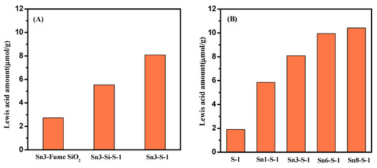 Dependences of the number of Lewis acid sites (estimated with the 1455 cm−1 band of pyridine adsorption FT-IR spectra after evacuation at 350 °C, following the procedures reported in [39,40]) of the Sn-containing catalysts on matrix (A) and Sn loading (B).