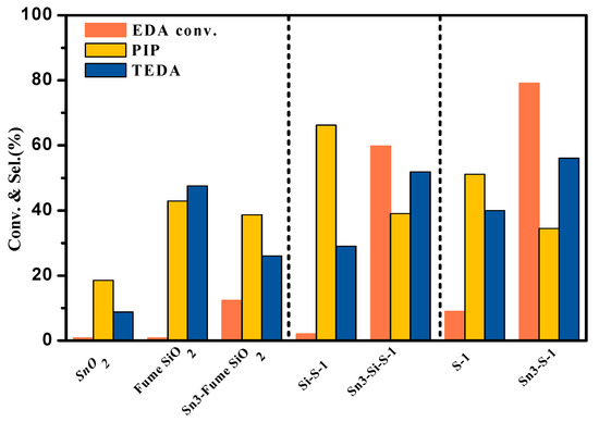 Effect of Sn loading on the conversion of EDA and the selectivity (to PIP and TEDA) of Sn-x-S-1 catalysts (for reaction conditions, see Figure 9).