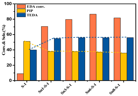 Figure 10 shows that Sn loading also has a significant influence on the catalytic performance of the SnO2 deposited defective S-1 zeolite catalyst. First of all, this can be seen from the evolution of EDA conversion. As the Sn loading increased, the EDA conversion increased first and then declined slightly. The maximum EDA conversion was obtained with 6 wt.% Sn loading. Interestingly, at low Sn loading (1 wt.%), a small increase of Sn loading had a very big promotion effect on the conversion of EDA; the conversion of EDA was increased from 9% (S-1) to 70.55% (Sn1-S-1), and the increment was almost 7 times. In addition, the dependence of the product (PIP and TEDA) selectivity on Sn loading is also impressive. The defective S-1 zeolite matrix produced more PIP than TEDA. However, in the case of Sn-containing zeolite catalysts, the product was dominated by TEDA, and this overturn happened right in the lowest Sn loading (1 wt.%). Once more, from Figure 7B and Figure 10 it is easy to see that the change of the acidity of the Sn-containing defective S-1 zeolite as Sn loading increased is in line with the catalytic performance change of the catalyst series. The enhancement of the acidity of the defective S-1 zeolite by the SnO2 deposition modification not only increased the catalytic activity of the defective S-1 zeolite but also adjusted the product selectivity of the zeolite in the intermolecular condensation of EDA. On account of the higher additional value of TEDA than PIP, the increase of TEDA selectivity via enhancing the acidity of the defective S-1 zeolite with SnO2 deposition modification has practical significance for the intermolecular condensation of EDA. As to the slight decline of the activity of the modified catalyst with very high Sn loading (e.g., 8 wt.%), we tend to think that it was mainly caused by the inaccessibleness of some of the catalysts’ active sites at very high Sn loading, but this issue must be made certain in the future work.