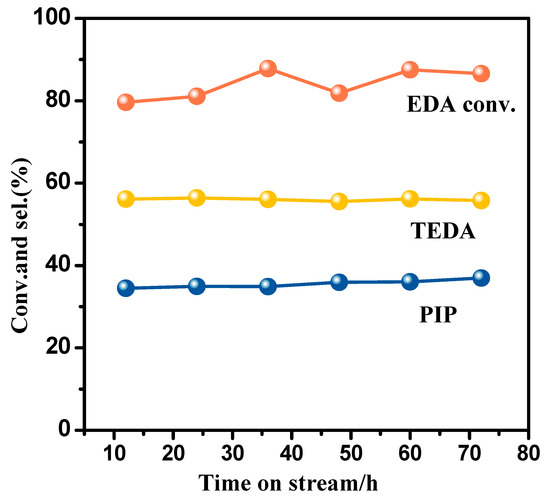 In order to know whether or not the highly alkaline EDA reactant and TEDA and PIP products involved in the intermolecular condensation can avoid the strong adsorption on the acidity enhanced defective S-1 zeolite, so as to guarantee a stable reaction activity, a preliminary durability test was conducted with selected catalyst Sn6-S-1. Figure 11 shows that the condensation of EDA could conduct smoothly over the SnO2 modified catalyst within 80 h, which implies that the acidification of the defective S-1 zeolite by SnO2 deposition modification did not result in the strong adsorption of the highly alkaline EDA and TEDA and PIP on the modified catalyst. Thus, the defective S-1 zeolite modified with the SnO2 deposition method could be a suitable catalyst for reactions involving highly alkaline reactants and products. In future study, the coking deactivation and coke-burning regeneration of the Sn-containing defective S-1 catalyst will be investigated in detail.