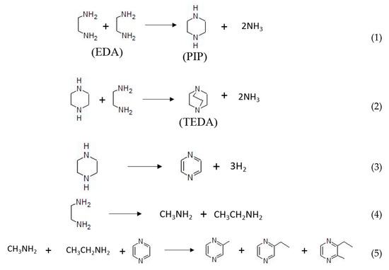 The main reaction paths of ethylenediamine (EDA) over solid acid catalyst [8,11]. ((1)–(2): Main reactions; (3)–(5): Side reactions).