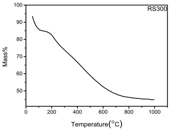 The thermal stability of RS300 was examined by a synchronous thermal analyzer. It is shown in Figure 1. A preliminary loss of weight occurred at 30–150 °C, indicating that the absorbed water broke away from RS300 by evaporation. The slight loss of quality at 150–240 °C indicated that the partially bound water was removed. The next dissociation zone in the temperature range of 240–400 °C indicated that carbonization at higher temperatures might lead to an excessive breakdown of the macromolecules and removal of organic portions. For example, the glycosidic bonds of the cellulose and hemicellulose structure of RS300 had an open-loop fracture, leading to the formation of some new products that contained carbon–oxygen double bonds (i.e., carboxyl and carbonyl) and volatile compounds with low molecular weights (i.e., carbon dioxide and carbon monoxide). At around 400–800 °C, more loss of weight took place, and the crystallization zone of cellulose and hemicellulose of RS300 were greatly damaged, leading to a decreased polymerization degree in its structure, which may be assigned to the transformation of cellulose and hemicellulose structure into a graphite structure []. Thus, the carbonization temperature during catalyst preparation was selected as a low-temperature value (<400 °C) to retain the primitive structures of RS, as carbonization at higher temperatures might lead to the formation of a rigid structure and be bad for loading −SO3H groups.