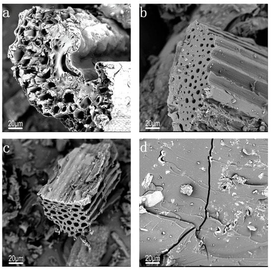 The rice straw is gramineae species and mainly composed of cellulose. The contents of cellulose, hemicellulose, and lignin of rice straw were approximately 43.15%, 16.96%, and 16.64%, respectively []. There are more vascular bundles and catheters in the rice straw, which suggests the presence of a well-developed pore structure and medium mechanical strength in the rice straw. Thus, the rice straw allows more sulfuric acid to enter the pores, resulting in the increase in the number of strong acid sites.
