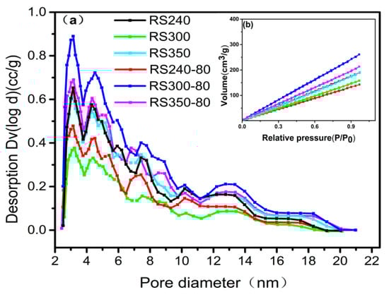 The morphology of carbon precursors and the corresponding carbon-based solid acid catalysts were analyzed by SEM, as shown in Figure 2. The surface of RS240 and RS300 were curly and smooth. However, RS350 showed irregular and cracked surfaces when the temperature of carbonization was increased. This phenomenon was attributed to carbonization at a lower temperature, the primitive structures of RS wasn’t destroyed. As the temperature of carbonization increased, and might lead to excessive breakdown of the macromolecules and cracking of glycosidic bonds. The morphological characteristics of RS240-80 presented massive tearing structures. It might be that the RS retained partially bound water and the structure of original cellulose in the low-temperature carbonization (e.g., 240 °C), leading to glucose reaggregation during the cellulose hydrolysis of RS240 in concentrated H2SO4. Therefore, the SEM images of RS240-80 demonstrated a collapsed and lumpy structure. As the carbonization temperature rose, the morphological structure of RS300-80 was nearly the same as that of the corresponding carbon precursor. One possible explanation for this phenomenon is that the partial breakdown of the hydrogen bonds of macromolecules and complete removal of bound water at 300 °C caused a decrease in the extent of glucose reaggregation during cellulose hydrolysis of RS300 in the concentrated H2SO4. Similarly, well-developed tubular porous features were observed in RS300 and RS300-80. However, the SEM images of RS300-80 showed an irregular rough surface compared to that of RS300. This may be attributed to the formation of a “soft” structure by low-temperature carbonization, which could have allowed more sulfonic acid (−SO3H) groups being loaded on RS300 [], resulting in the slight change on the surface of RS300 during the sulfonation process. In addition, RS300 had abundant pores with different sizes and a smooth surface, and this also provided more loading sites of sulfuric acid, which resulted in a higher covalent binding energy for carbon and sulfonic acid (−SO3H) groups []. When the carbonization temperature was above 300 °C, RS350 became harder, and the flexibility of the polycyclic aromatic carbon decreased through plane growth and carbon sheet stacking. Thus, the general texture of RS350-80 showed little changes after sulfonation. As the temperature of carbonization increased, the pore structure of the catalyst became more abundant (<300 °C), which further increased the temperature, and the overall structure of the catalyst appeared split and faulty. The former was attributed to the "soft structure" of precursor formed under low temperature carbonization, which was easily changed by concentrated sulfuric acid in the process of sulfonation, including dehydration, hydrolysis, and −SO3H groups loading. The latter RS forms a "hard structure" under high-temperature carbonization, which was difficult to be changed by concentrated H2SO4.
