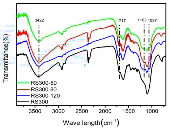 Fourier transform infrared spectroscopy (FT-IR) spectra of RS300, RS300-50, RS300-80, and RS300-120.