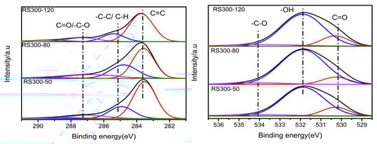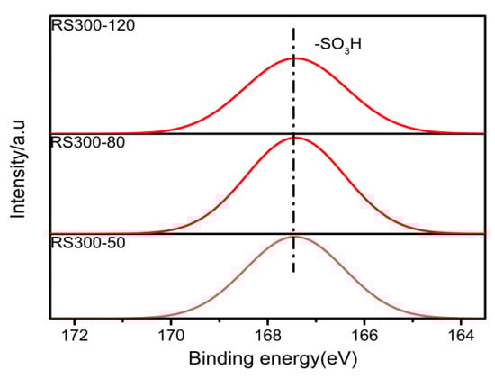 In Figure 6, XPS tests were conducted to characterize C 1 s, O 1 s, and S 2 p chemical states of RS300-50, RS300-80, and RS300-120. The peaks with a binding energy of 283.6, 285.5, and 286-287 eV were attributed to aromatic carbons (C=C), aliphatic carbons (–C–C/C–H), hemiacetal, and carboxylic carbon (–C=O), respectively []. The C=O, –OH, and –O–C type oxygen peaks were located at 531.7, 532.9, and 533.7 eV, respectively. The binding energy of S 2 p (e.g., 167.5 eV) shifted to a higher wavenumber compared with the electron-binding energy atlas (e.g., 164 eV), indicating that the sulfur element in the catalyst had a positive charge, and almost all of the S atoms in catalyst were contained in –SO3H groups. It provided further evidence that the sulfonic acid group had been successfully loaded onto the catalyst. Hence, the densities of –SO3H sites in the carbohydrate-derived catalysts could be calculated based on the S content in the catalyst [].