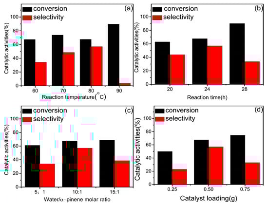 Performance of biomass carbon-based solid acid catalyst: (a) effect of reaction temperature; (b) effect of reaction time; (c) effect of water/α-pinene molar ratio; and (d) effect of catalyst loading. Other reaction conditions were held constant.