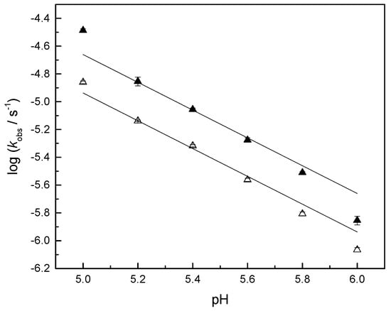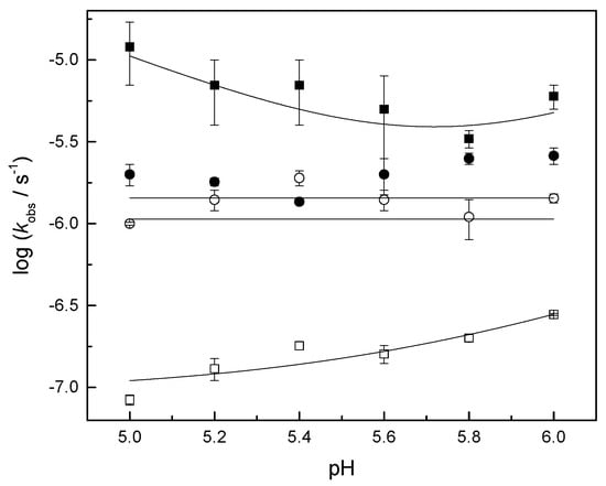 KW is the ion product of water under the experimental conditions (6.2 × 10−13 M2) and k1W and k1OH the first- and second-order rate constants for the pH-independent and hydroxide ion catalyzed reactions, respectively. The rate constants obtained (Table 2) were in good agreement with those reported previously for similar model compounds [].
