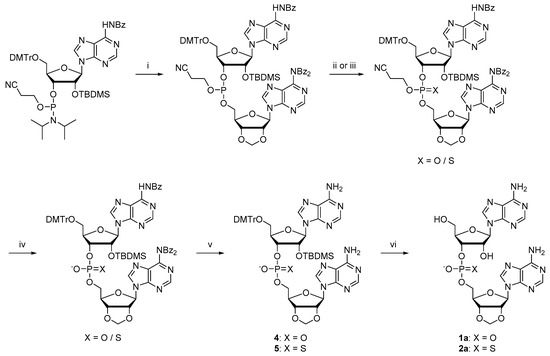 Phosphodiester 1a and its phosphoromonothioate analog 2a (as RP and SP diastereomers) were prepared as described in Scheme 1 by displacing the diisopropylamino ligand of an appropriately protected adenosine 3′-(2-cyanoethyl-N,N-diisopropylphosphoramidite) by N6,N6-dibenzoyl-2′,3′-O-methyleneadenosine (3), using 5-(benzylthio)-1H-tetrazole as an activator. The phosphite triester formed was oxidized to either phosphate or thiophosphate ester by treatment with either elemental iodine in a mixture of tetrahydrofuran, water and 2,6-lutidine or elemental sulfur in dicholoromethane. The cyanoethyl group was removed in a mixture of pyridine and Et3N and the benzoyl groups in a mixture of aqueous ammonia and methylamine to afford intermediates 4 and 5. Finally, removal of tert-butyldimethylsilyl and dimethoxytrityl groups by treatment with triethylamine trihydrofluoride, followed by RP-HPLC purification, gave the desired products 1a and 2a. The two diastereomers of the phosphorothioate product 2a were separable by RP-HPLC and were assigned absolute configurations based on their 31P NMR chemical shifts, as described in the literature [].