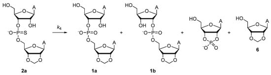 The rate of desulfurization was determined separately for both diastereomers of adenylyl-3′,5′-(2′,3′-O-methyleneadenosine) phosphoromonothioate (2a) at 0 °C and pH 6.9 and either in the absence or at a saturating concentration of Hg(II). The ionic strength was adjusted to 0.10 M with sodium nitrate. Desulfurization of 2a (Scheme 4, k4) was accompanied with apparent isomerization and cleavage of the immediate product 1a, the observed products being 1a, 1b, cAMP and 6 in a 5:4:1:1 ratio. As discussed in the literature [], desulfurization of ribonucleoside phosphoromonothioates is initiated by nucleophilic attack of the neighboring OH group to give a pentacoordinate intermediate. Loss of hydrogen (or, in the presence of Hg(II), mercuric) sulfide from this intermediate leads to a cyclic phosphotriester that rapidly decomposes by rupture of either one of the endocyclic P-O bonds, affording 1a or 1b, or the exocyclic P-O bond, affording cAMP and 6. This mechanism also explains the apparent competition between cleavage and desulfurization reported previously []—desulfurization always occurs first, and the competition is actually between endo- and exocyclic P-O bond fission. In the absence of Hg(II), desulfurization of both diastereomers of 2a proceeded at nearly equal rates (k4 = 7 ± 2 and 6 ± 2 × 10−8 s−1 for Sp and Rp diastereomers). The product distribution was unaffected by the presence of Hg(II), but the rate of desulfurization was increased by more than four orders of magnitude (k4 = 4 ± 1 and 1.4 ± 0.1 × 10−3 s−1 for Sp and Rp diastereomers).