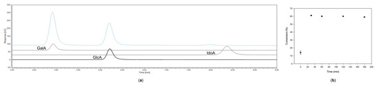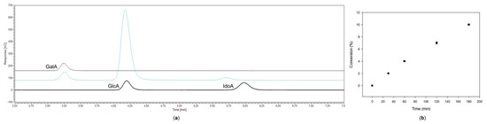 Product formation by TgUGAE crude cell lysate. (a) Chromatographic analysis of the reaction mixture (blue). The peaks were compared to known standards (black). The nucleoside diphosphate (NDP)-sugars of the reaction mixture were hydrolyzed to their respective monosaccharides prior to analysis. GalA: galacturonic acid; GlcA: glucuronic acid; IdoA: l-iduronic acid. (b) Conversion of UDP-glucuronic acid toward UDP-galacturonic acid over time.