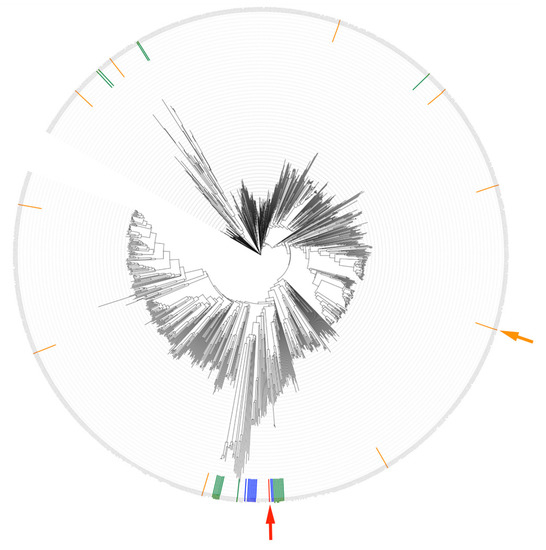 - Sievers, F.; Wilm, A.; Dineen, D.; Gibson, T.J.; Karplus, K.; Li, W.; Lopez, R.; Thompson, J.D.; Higgins, D.G.; Mcwilliam, H.; et al. Fast, scalable generation of high-quality protein multiple sequence alignments using Clustal Omega. Mol. Syst. Biol. 2011, 7, 1–6. [Google Scholar] [CrossRef] [PubMed]