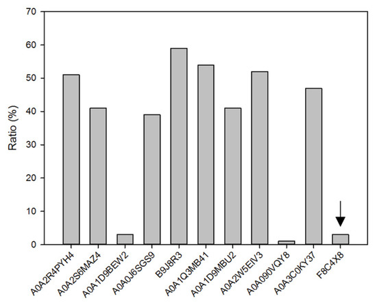 Ratio of ‘UDP-glucuronate 5-epimerase’ sequences in the BLAST results of the randomly selected putative UGA5E sequences. The sequences are represented by their UniProt entry. TgUGAE is indicated by an arrow.