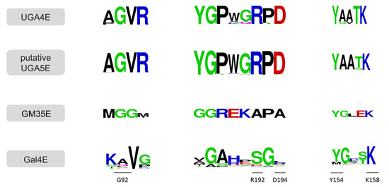 This hypothesis is supported by a more detailed sequence analysis. Sun et al. recently solved the first crystal structure of an UGA4E (i.e., from Streptomyces viridosporus, PDB 6KV9) and found that crucial interactions are formed with the substrate at positions G92 and R192 [20]. Moreover, R192 is believed to favor the sugar ring rotation that is needed for C4-epimerization, and its correct orientation would be ensured by the adjacent D194. The conservation of these residues, and their environment, in all of the UGA4Es characterized to date is displayed in Figure 6. Crucially, the sequence logo of the putative UGA5E sequences is found to be practically identical. In order to make a comparison to a related C5-epimerase, GM35E from the same CEP1 family was analyzed as well. In addition, the sequence logo of UDP-glucose 4-epimerase (Gal4E), the most studied specificity within the CEP1 family, was also included. As a totally different sequence logo was obtained for the latter two epimerases, it can be concluded that the residues are not simply conserved among all CEP1 members or even among enzymes with the same epimerization site. Accordingly, G92, R192, and D194 can probably serve as fingerprints for the UGA4E specificity. In addition, similar differences are observed in the YxxxK catalytic motif (Figure 6). These results indicate that the putative UGA5E sequences are probably just incorrectly annotated UGA4Es.
