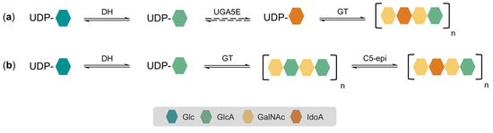 On that account, this study focused on the UGA5E specificity, hypothesized to catalyze the reversible epimerization of UDP-GlcA toward UDP-IdoA [9]. The enzyme’s activity was only detected in rabbit tissue before, and there is no report on the recombinant expression or characterization of a putative UGA5E to date. This research clustered all 1154 putative UGA5E sequences from the UniProt database in a phylogenetic tree and the combination of experimental work and in silico analysis resulted in the hypothesis that these sequences actually display UGA4E specificity. Subsequently, the existence of the UGA5E specificity in general was questioned, resulting in a physiological issue. Indeed, it was previously hypothesized that UGA5E is part of the enzymatic pathway for the production of IdoA-containing DS starting from UDP-Glc (Figure 7a) [9]. To shed more light on this issue, pathways relevant for other eukaryotic and prokaryotic IdoA-containing polysaccharides, e.g., heparin sulfate, were examined [11,14,29]. These metabolic pathways start with the action of an UDP-Glc dehydrogenase, converting UDP-Glc into UDP-GlcA. However, this sugar acid is then first polymerized before the resulting polysaccharide undergoes modifications such as sulfation or epimerization. In other words, GlcA is, thus, epimerized to IdoA at the polysaccharide level instead of at the NDP-sugar level. For the bacterial GAGs structures and heparin/heparan sulfate, this epimerization step is catalyzed by an enzyme referred to as glucuronyl C5-epimerase (EC 5.1.3.17, CEP8) [30,31]. For dermatan and chondroitin sulfate synthesis, it was found that this reaction is realized by chondroitin-glucuronate C5-epimerase (EC 5.1.3.19, not classified in a CEP family) [32,33].