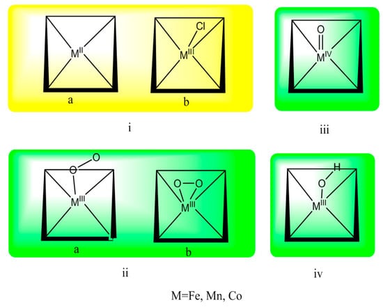 To the best of our knowledge, porphyrins and metalloporphyrins are considered as the most popular biometric catalysts in the functionalization of C-H with various substrates. For instance, alkane can be readily activated by a homogeneous manganese (III) porphyrin-iodosyl benzene oxidizing system []. Manganese porphyrins could also selectively catalyze the halogenations of C-H bond []. Oxidation of cyclohexene via molecular oxygen can be completed by cobalt porphyrin complexes immobilized on montmorillonite []. In addition to these experimental studies, theoretical studies were also widely performed to understand the catalytic role of these metalloporphyrins. For example, a DFT study found that tetra-amido macrocyclic ligands were substantially noninnocent to high-valent iron, cobalt, and nickel tetraamidomacrocyclic ligand (TAML) complexes []. A quantitative structure-activity relationship model (QSAR) study on metalloporphyrin catalysts was carried out in the oxidation of cyclohexane to adipic acid []. Theoretical studies were performed to explore a unique class of reactive molecules of iron(III)-nitro porphyrins [,]. Despite the diversity of active sites reported, a common mechanistic hypothesis for dioxygen activation is emerging. In this unified approach [,,], dioxygen might initially bind to a reduced metal center to form a metal-superoxo complex, and subsequently the peroxo intermediates [,]. Then, O-O bond cleavage of metal-hydroperoxo species possibly results in the formation of high-valent metal-oxo oxidants [,,], which are considered as the reactive species to oxidize the substrates. Therefore, it is significantly important to determine the corresponding reactive intermediates and evaluate their chemical properties.