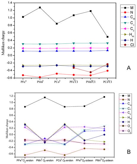 To explore the dedicate structure of intermediates, the Mulliken charge of these metalloporphyrins was also analyzed (see Figure 5A). Interestingly, for all these complexes, the metal center is the most positive site, while N atoms are present with the most negative charges. Additionally, no great difference was observed in all H and C atoms from these metalloporphyrins. Specifically, the charge distributed on Fe, Mn, and Co atom was 1.02, 1.276, and 0.846, respectively. Thus, a more positive charge was observed on MnIII than FeIII and CoIII cations. For negative change on N atoms, those N atoms from MnIII porphyrin had slightly lower negative charge than those present in Fe and Co porphyrins. The charge distribution property of these metalloporphyrins with chloride as axial ligand is similar to the order of that derived from metalloporphyrins without chloride ligand. The metal center and N atoms in PMnIIICl complex have the highest positive charge and mostly negative charge, respectively. Furthermore, the axial Cl ligand in PMnIIICl complex also show much negative charge (−0.5), which had a decreased effect on the charge of CoII ion. We presumed that the electronic structure can greatly influence the catalytic reactivity, because these metal centers are the active sites for the oxygen absorption and activation. Based on our Mulliken charge distribution results, we concluded that PMnII was much easier to combine with molecular oxygen than Fe and Co porphyrins, due to the presence of most positive charge on Mn center.
