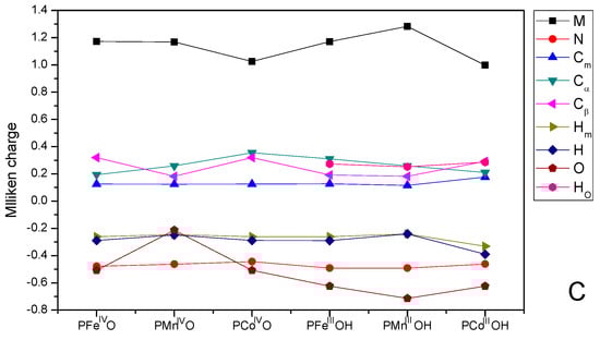Mulliken charges on: (A) PMII/PMIIICl (M=Fe, Mn, and Co); (B) PMIII-O2 (M=Fe, Mn, and Co); and (C) PMIV = O/PMIIIOH (M=Fe, Mn, and Co).