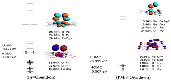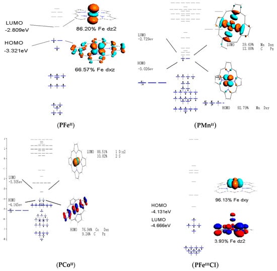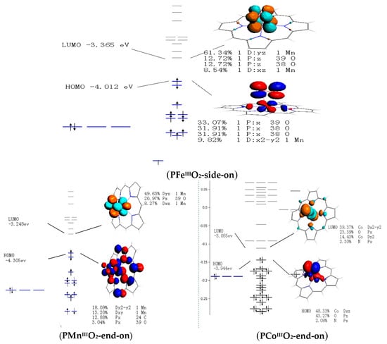 Frontier molecular orbitals of PMIII and PMIII-O2 (M=Fe, Mn, and Co).